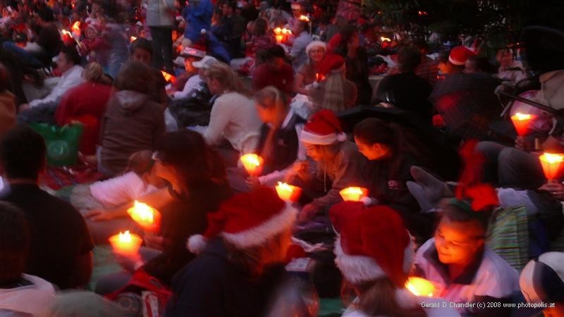 We found the entire grassy bowl in front of the stage covered with people and wondered if we would find a spot, but being only two and without all the paraphernalia that most groups had brought, we found an empty square meter in front of a trio of young people and asked could we sit there. They responded with the formulaic, but no less heart-warming "No worries", and after answering Gerry's questions about the candles everyone was carrying, gave us one that they said they didn't need. And so we joined the throng of candle-carrying would-be carol-singers. The effect of all those candles protected by red paper cups grew as dusk turned into night and the entire field was peppered with light. The atmosphere was warm and fun-loving, but somehow un-Christmassy in spite of Santa hats and reindeer ears because of the missing tang of cold winter air.