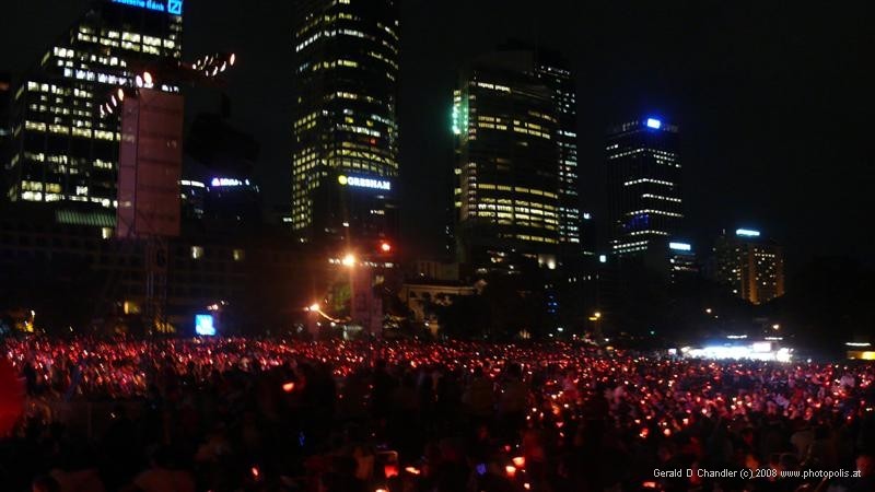 And then the program began. We were lucky to be high enough to see most of the stage and all of two of four giant screens that would display the TV broadcast carried by one of the national commercial channels. The show began with a medley of favorite carols sung by various Aussi personalities, moved into a more updated mode with Christmas songs (rather than carols) sung by pop-stars including the latest Australian Idol, a young Irishman called Damien Lee. There was also an interlude for the kiddies with a famous team from a children's TV show called the Wiggles dancing and singing to welcome Santa to the stage. It was wonderful to see the little ones all around us dancing along to this part of the show.The last stage was more favorite carols like Silent Night and O Little Town of Bethlehem. Perhaps the only peculiar appearance was that of a famous singer whose wife, also an actress/singer had recently died of breast cancer. His rendering of a Christmas song was accompanied not only by film clips of her before her illness but also by a recording of her singing the same song at the Domain Carols show from a previous year, creating a split-time duet.