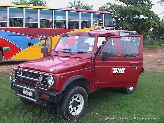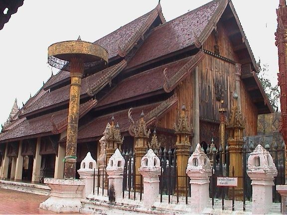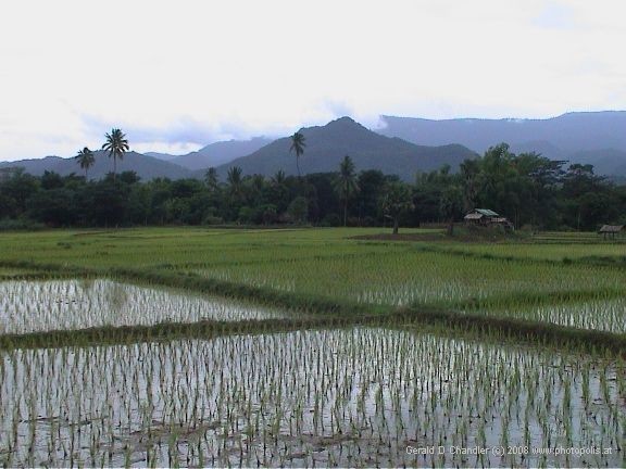 In Chiang Mai we twice rented a car. And twice we got very lost. The first time it was just to see how far we could go and the second time because in spite of getting lost the first time we enjoyed the freedom of being able to drive and Gerry wanted to get to the top of the mountain. This is the little Suzuki Carribian that we rented. It was a bit like a tin can but it was very reasonably priced and did get us both there and back without any real mechanical problems. Advertized as a 4-wheel drive runabout, we found it just too underpowered to take us over any rough terrain. This wonderful old Lanna-style wooden temple in Lampang was one of our main goals for our first day's outing. It was unusual by comparison to other Chiang Mai temples we knew in that it is made entirely of wood that is stained rather than painted and its architecture is open-sided giving it an wonderfully airy feel. When we were there it was beseiged by a large group of Thai schoolchildren, who found us about as amusing and interesting as we did them. There was also a small garden in back and two or three smaller temples in back of the main building. This was one temple definitely worth a detour. This is an example of the glorious scenery we found during our excursion. We really wanted to be in the mountains you can see there and had hoped to get close to the top of Doi Inthanon, the highest peak around. Alas, our maps were inaccurate and we didn't have our Lonely Planet with us and so although we had great fun, we never really made it to the National Park of which Doi Inthanon is the core. We never got tired of this kind of southeast Asian landscape with its water-filled rice paddies, lush green vegetation, and imposing high mountain backdrop. We saw more of it in Vietnam and Loas than Thailand, but we have to say that Thailand is no slouch when it comes to scenery. Here is another taste of rural life in the Chiang Mai countryside. For all the sophistication of the large cities like Bangkok, the countryside is still quite primitive with lots of work done by hand rather than machine. But as you can see the road here is paved and with paved roads come the inevitable motor bikes and cars that testify to increasing wealth. What the rural landscape did not have was signage. And what signs it did have were incomprehensible to us being in the Thai alphabet and impossible for us to find on our very inadequate map. But we mostly enjoyed getting lost in small farming villages and on country roads. Wouldn't you in this kind of environment? Here we are off the beaten track, still trying to get to Doi Inthanon for the second time. When we did finally find a track that went in the right direction, it quickly became so steep and it was so muddy and slippery that even in our supposedly 4-wheel drive vehicle, we declined to attempt it. As we were driving back to town, the road took us along this river which is where many tour groups go rafting and for elephant rides. We saw a group disembarking and vaguely wondered if we should do such a thing. |