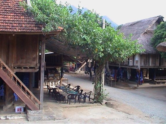 Just sixty years ago getting to Mai Chau was a several day trip from Hanoi. But modern roads have cut that to a few hours. Now most visitors — tourists — come the 160 km from the south. But we came from the north to spend the last few days of our 1200 km circuit by bumpy four-wheel drive in another ethnic village. We got to Mai Chau in the middle of the afternoon and drove off the main road, down a paved rood, across a stream, and into the village of Ban Lac. It had one main street that was unpaved and lined on both sides with thatched-roof stilt houses. Most of the houses had converted the space under the house into a shop for selling hand-made ethnic handicrafts, mostly textiles and various kinds of handbags. It was clear that the main industry in this village was tourism and that the flow of tourists was quite constant. We were introduced to the owner of the house in which we were to stay, a young woman in her early thirties who spoke enough English to make herself understood and to understand most of what we needed to communicate to her. We had a cup of tea and then after she had shown Gerry the room where we would sleep and they had agreed on a rate of $5 each, we said our goodbyes to Phu and off he went to drive the rest of the day and most of the night to Bac Ha. He could not be persuaded to spend the night first. We retired to our room to relax and recover from the heat and exertions of our journey and to survey our new domain. The house we were in was in fact made up of three buildings linked together on three sides of a front courtyard that was set up as a small cafe. Our large room took up half of one building and resembled closely the room we had stayed in Coc Ly but without the balcony or the wooden bed frames. Here our beds were mats laid directly on the floor. The hotel provided clean sheets and mosquito nets that could be attached to cables strung between the main house pillars. The window openings could be shuttered at night for privacy and the house had electric power for lights, ceiling fans and the family's TV. On our first day, the city power failed several times, but the hotel's generator took up the load in the meantime, although not always very reliably. And finally, the $house was equipped just outside with a flushing toilet and a cold water shower. The height of luxury compared with Coc Ly, an interesting compromise between authenticity, in that our host family did live in the house and comfort not only for the guests but for the host family as well.