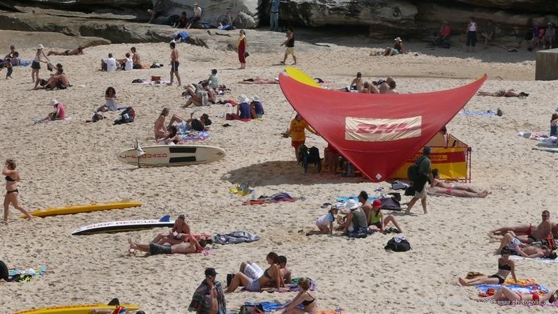 Bondi Beach is close enough to our place — five kilometers or three miles — that we could walk there. But for our first outing we took the train from Kings Cross, a station a five minute walk from us, to Bondi Junction. From there we walked (downhill, of course!) the last 1.5 kilometers. The photo above shows our first view of the beach as neared the south end of the beach. We had heard from a fan of another beach in the greater Sydney area that Bondi was not very good, but at first sight we guess any European would pay a lot to have such a beach on their front doorstep.