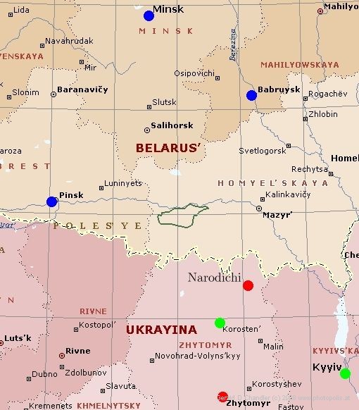 How do you get to Narodichi? Narodichi is almost on the border between Ukraine and Belarus. A line drawn the 480 km (300 miles) from Kiev, the capital of Ukraine to Minsk, the capital of Belarus, passes a bit north of Narodichi and a line from Kiev to Pinsk, the second city of Belarus, passes just south of Narodichi. Minsk and Pinsk are shown as blue circles on the map on the right; Narodichi and Kiev as green circles and Korosten and Zhytomyr as blue circles. Green represents a place where we spent a night; red is a place we visited; and blue is of importance for our story. Click here or on the map to see it in more detail. August 1, 1941, Heinrich Himmler, the head of the SS, issued an order to SS units preparing to comb the Pripet Marshes in Belarus: “All male Jews must be shot. Drive the female Jews into the swamp.” The SS officer in charge of the operation advised his superiors that “Driving women and children into the swamps did not have the intended success because the swamps were not deep enough for the Jews to drown.” Beginning in late September 1941 German forces carried out large-scale actions in which whole Jewish communities were wiped out. As if that were not enough, the Chernobyl nuclear plant that exploded in 1986 spread radiation sickness to the village. Although not in the most dangerous zone, it was in the zone of secondary effects. The village had been evacuated in 1990 because of the health effects and villagers were told not to drink the local milk or eat meat from local livestock. The government promised them apartments in Zhytomyr but has taken more than ten years to make good on the promise. Sixteen years after the accident, Ukrainians are starting to move back into the village in spite of the health effects because houses and smallholdings are sitting empty.