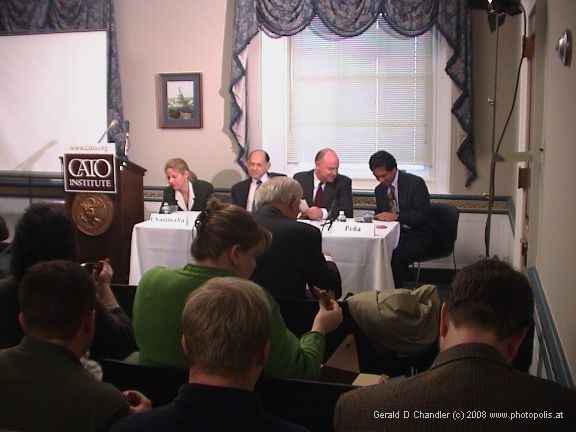 The Cato Institute is a libertarian public policy think-tank that spends much of its effort lobbying Capitol Hill decision makers. All of their 'briefings', as they call them, are held in the Longworth House Office building, just beside the Capitol. We attended two of them in December and were happy to learn that registering for a briefing entitles you to a free box lunch. They are obviously anxious to attract as many House and Senate staffers as they can. The format is fairly standard. One, two, or three speakers talk for 20 minutes each followed by a Q&A session. Total Information AwarenessThe first talk we attended was on the new policy being discussed by the administration that involves doing so-called data mining (checking records of credit-card transactions among others) to weed out terrorism suspects. The Cato Institute thinks that the policy is an assault on civil liberties and so is against it.